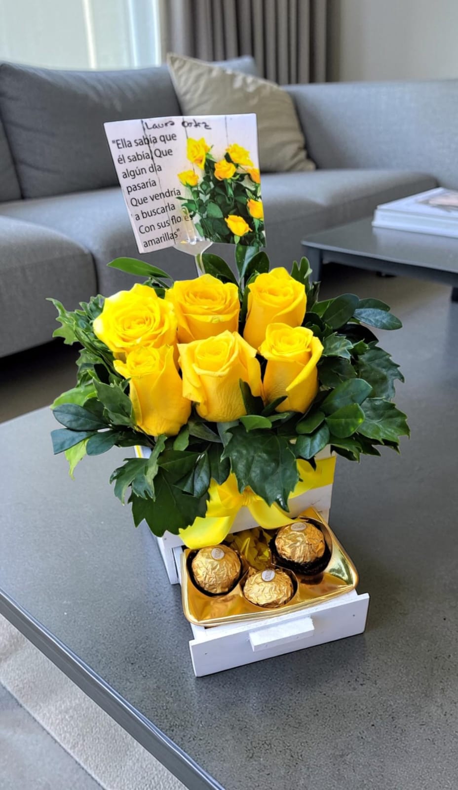 Regala este joyero con 6 rosas amarillas y 3 chocolates Ferrero Rocher